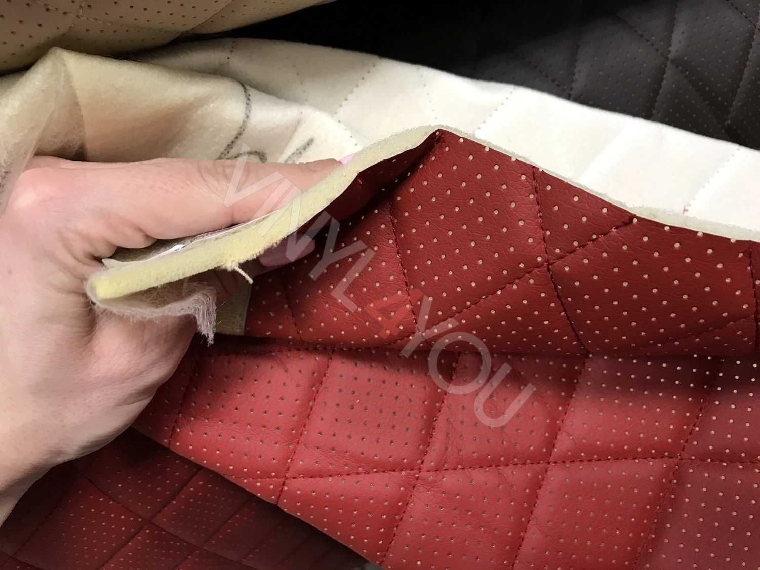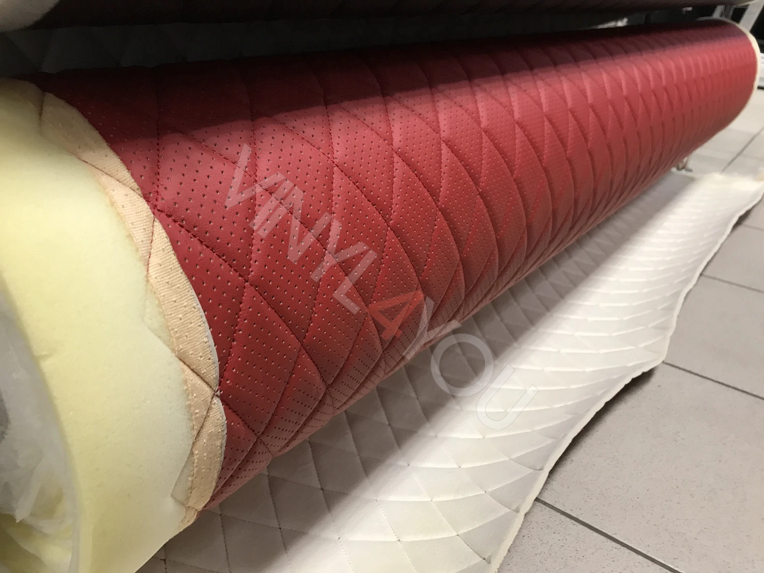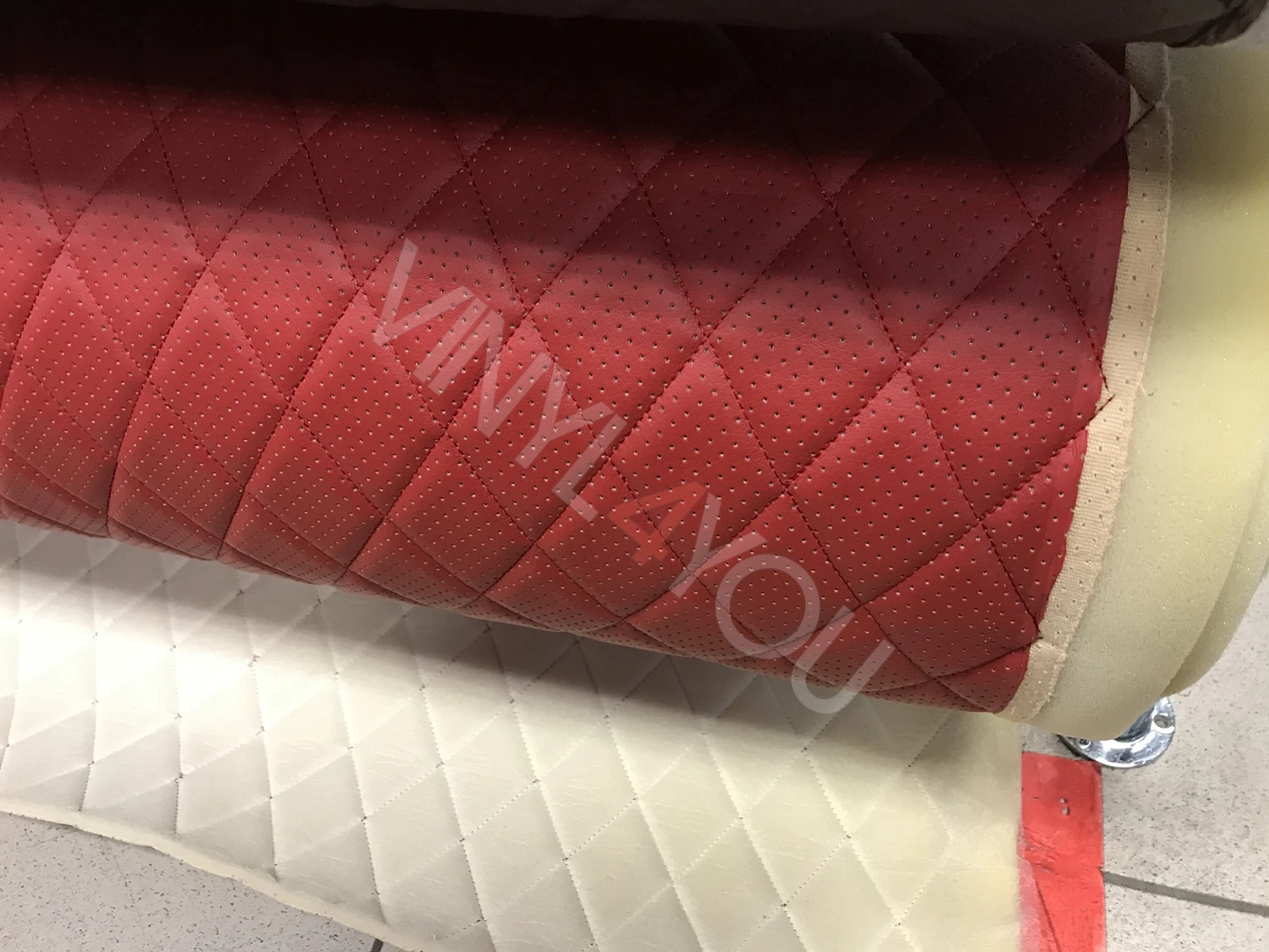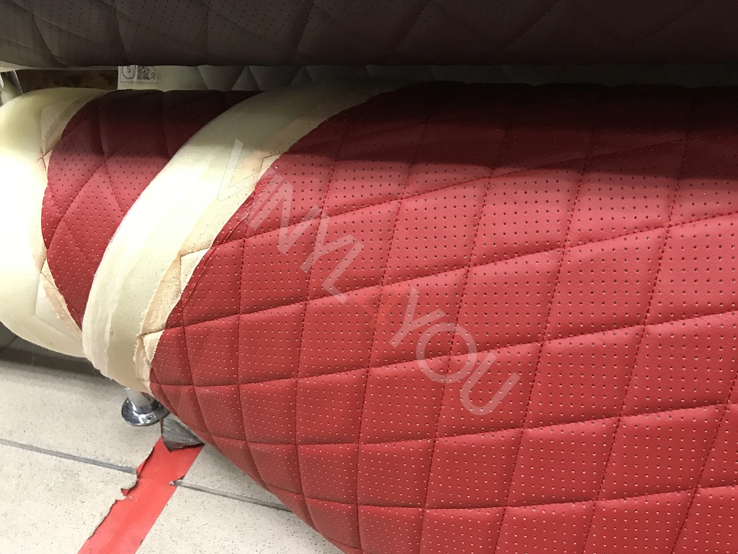 Экокожа стеганая перфорированная Ромб Красная с Красной строчкой